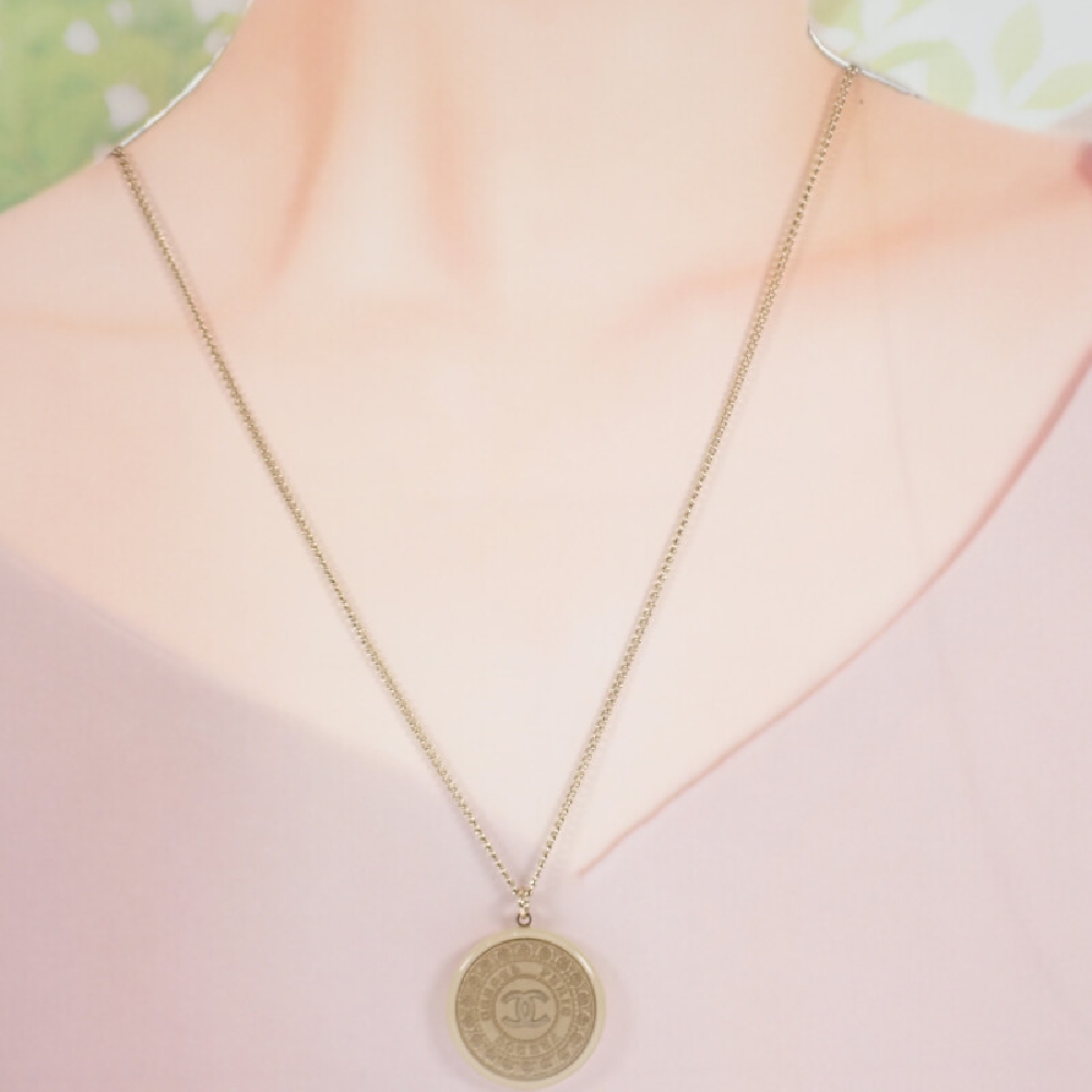 コインを思わせるサークルモチーフが、ゴールドとベージュの上品なカラーリングで印象的にデザインされています。